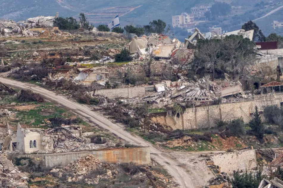 An Israeli flag floats next to destroyed buildings in southern Lebanon, as seen from northern Israel, on Sunday. (Photo: AP)