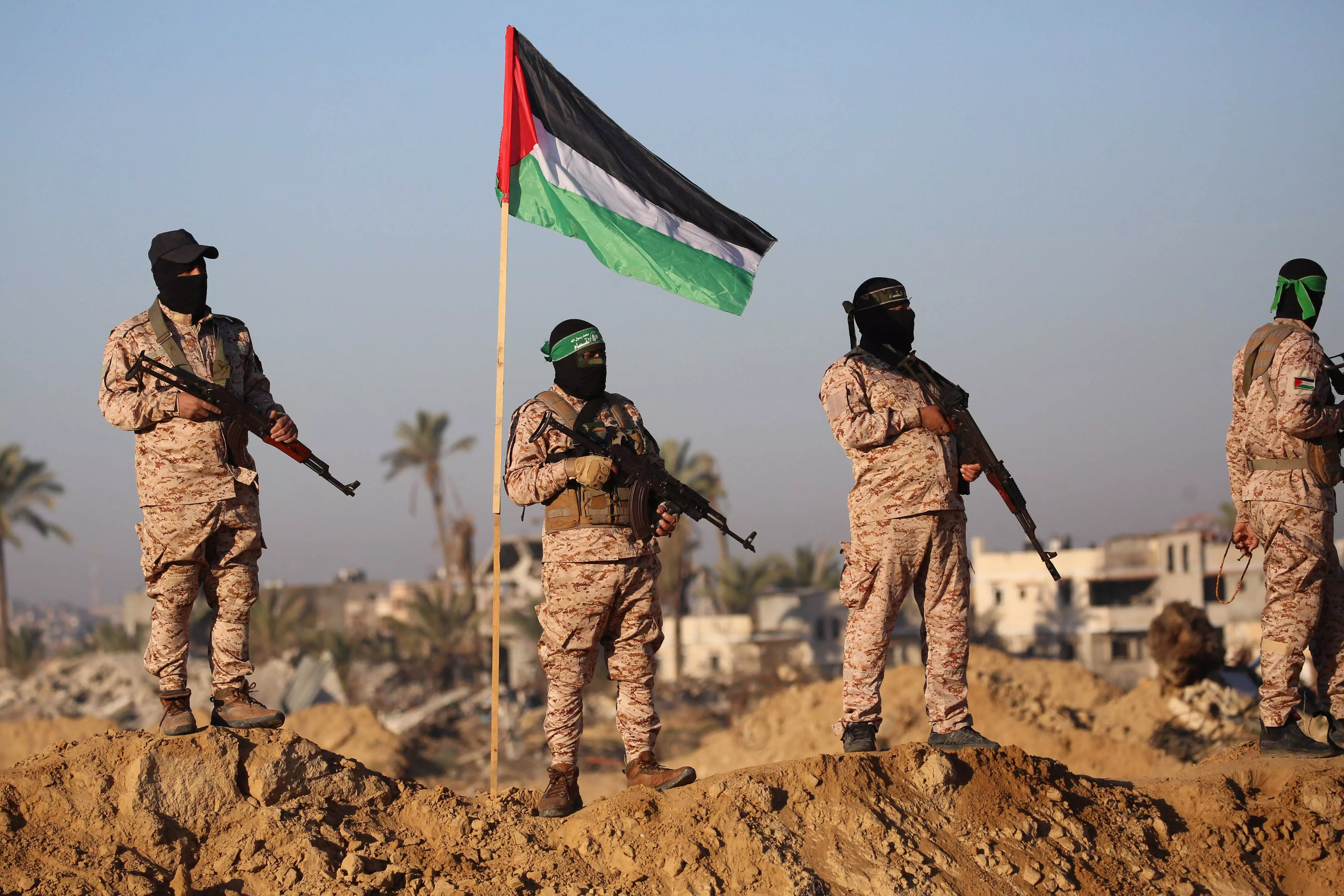 Palestinian militant group Hamas fighters secure an area before handing over Israeli hostages to a Red Cross team in Khan Yunis in the southern Gaza Strip (Bashar TALEB / AFP)