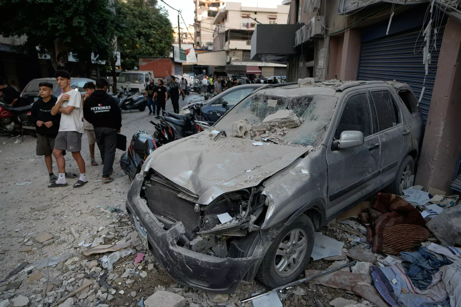 People pass next of a damaged car at the site where an Israeli strike hit at an apartment building on Dahiyeh in the southern suburb of Beirut (AP)