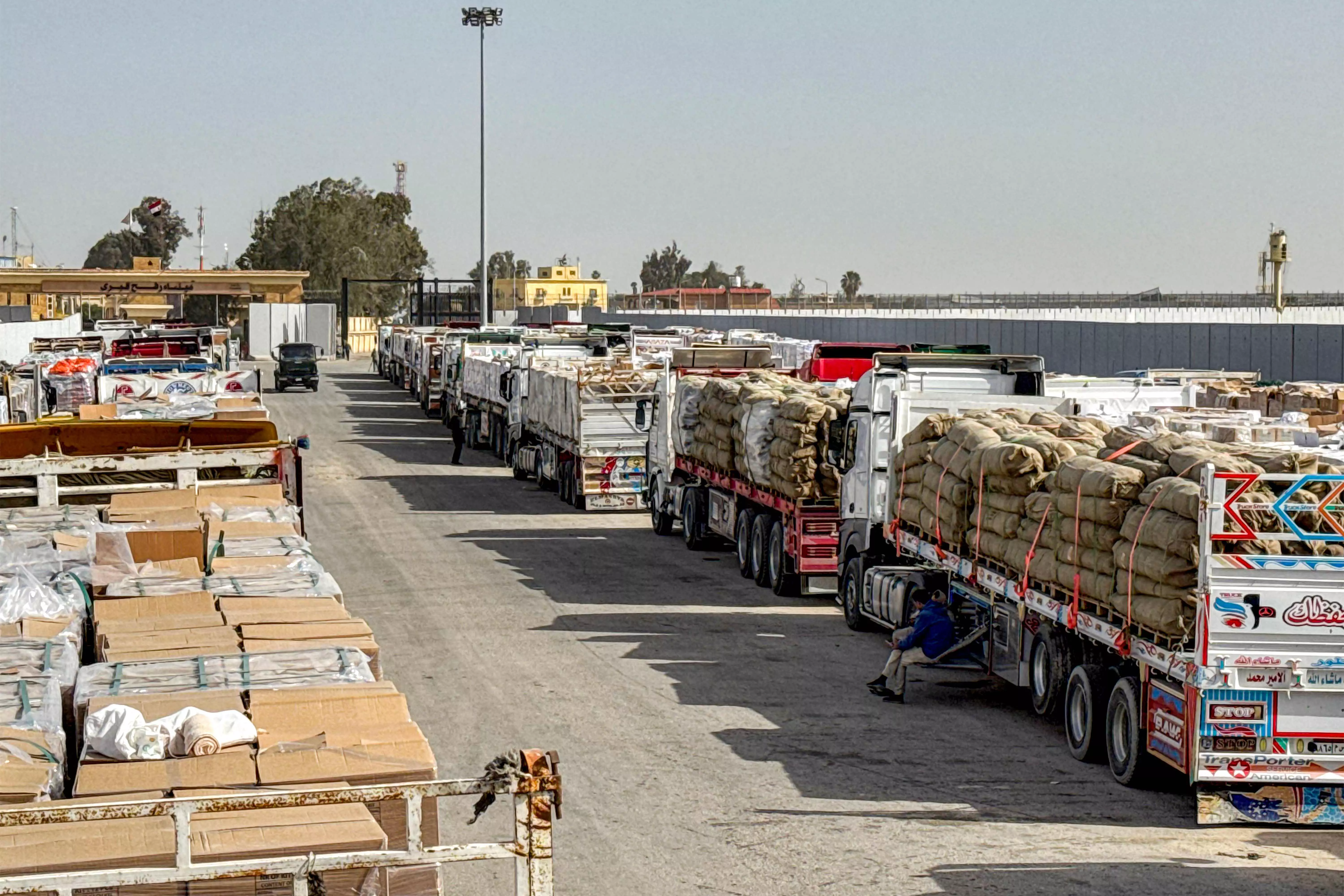Trucks transporting humanitarian aid wait to enter through the Egyptian side of the Rafah border crossing with the Gaza Strip in northeastern Egypt, as the vital crossing to the Palestinian territory reopens (AFP)