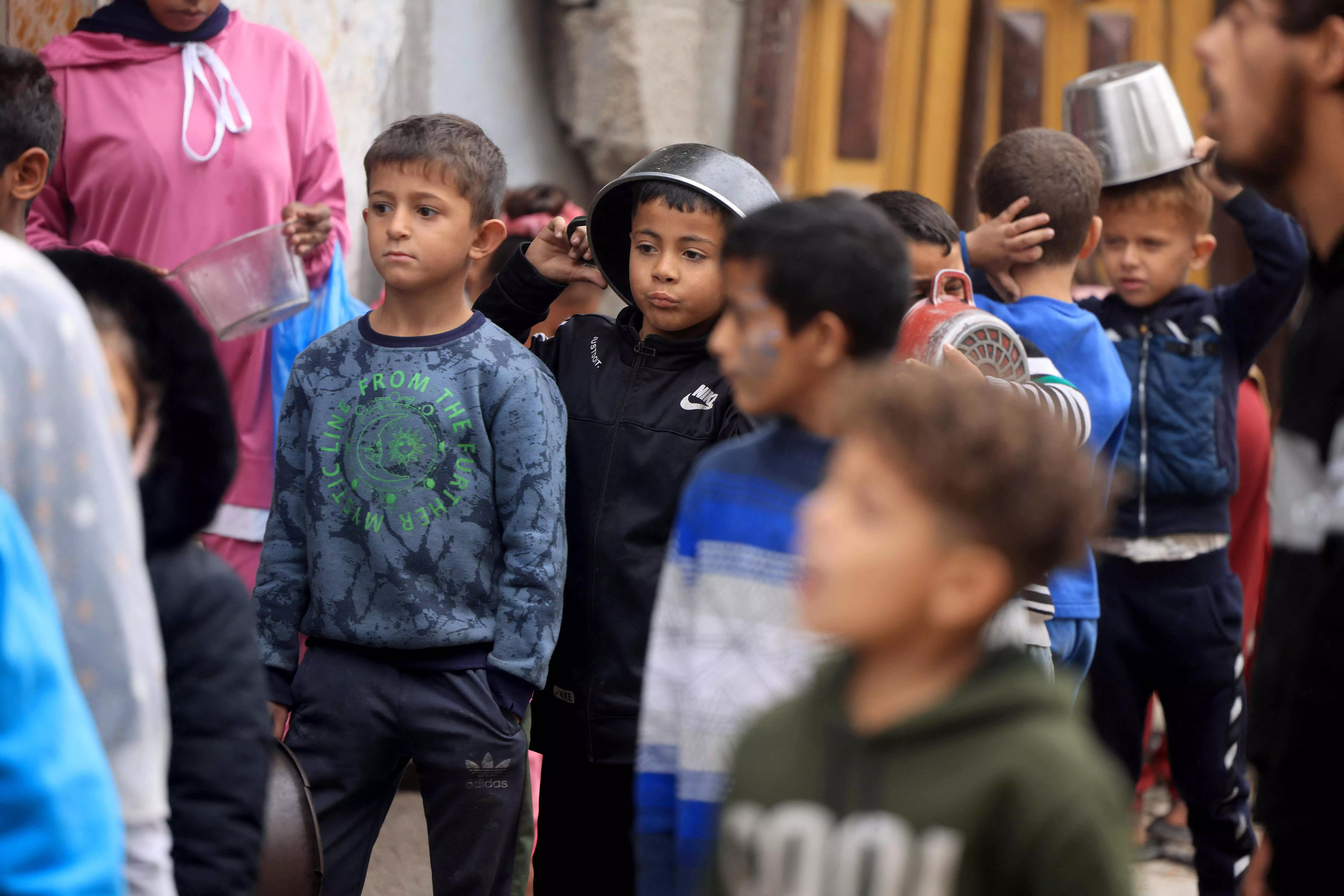 Displaced Palestinian children wait with their pots to collect a meal from a food bank, in the Khan Yunis refugee camp in the southern Gaza Strip (AFP)
