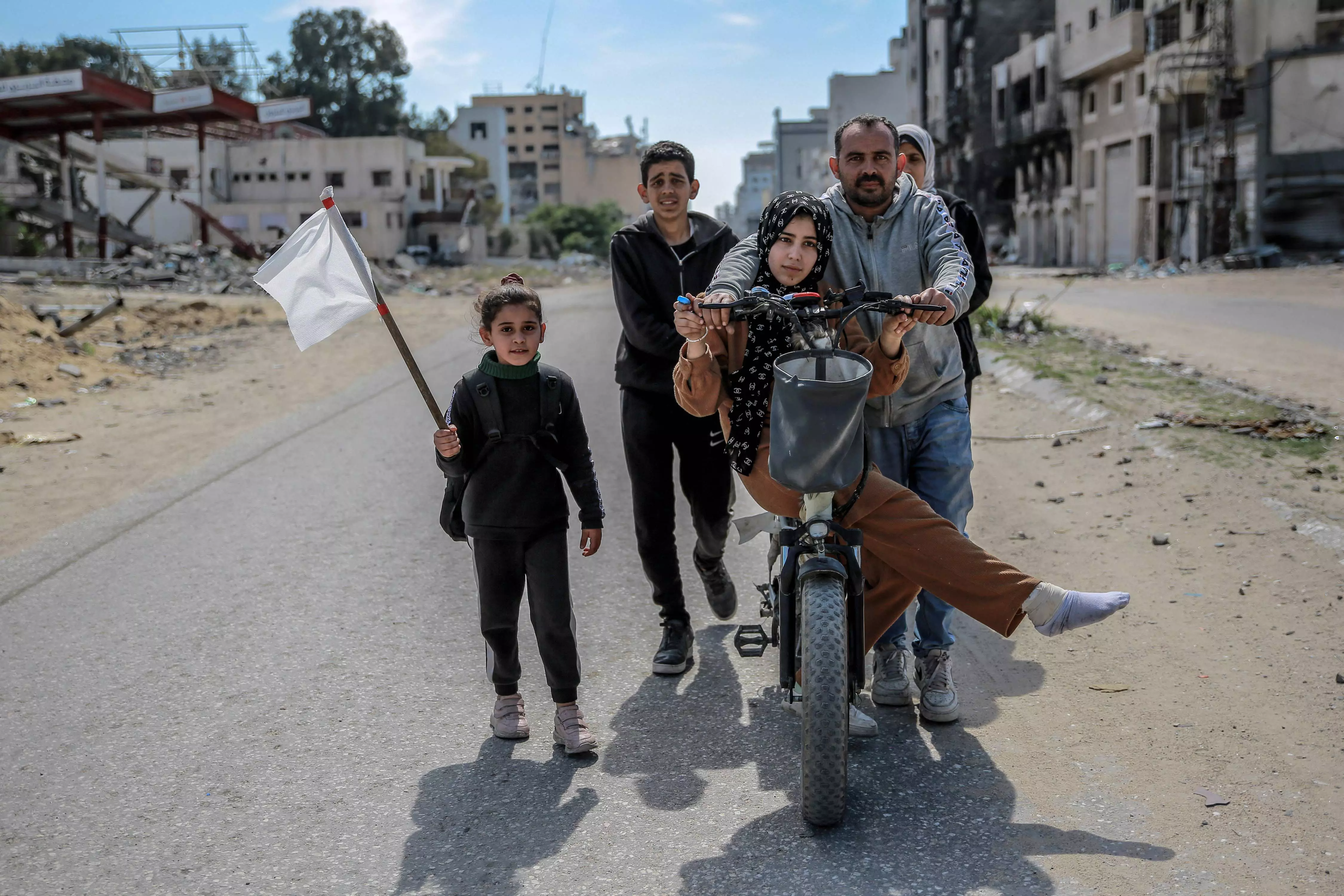 A girl holds a white flag as a displaced Palestinian family walks in Gaza City, amid the ongoing conflict between Israel and the Palestinian Hamas movement. (AFP)