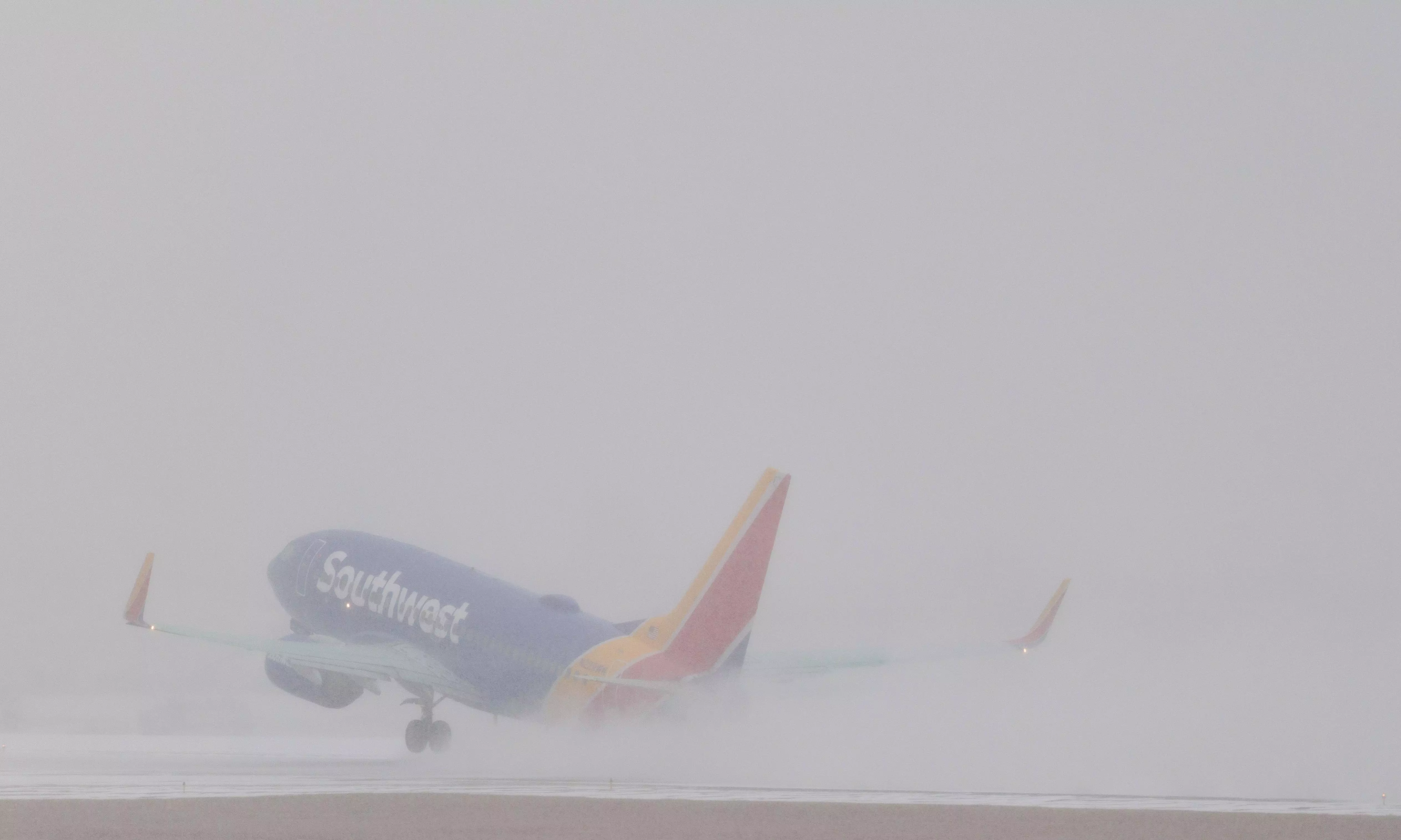 A southwest flight takes off at Nasvhille International Airport as snow falls on January 24, 2026 in Nashville, Tennessee. A massive winter storm is expected to bring frigid temperatures, ice, and snow to millions of Americans across the nation. (Photo by Brett Carlsen/ Getty Images via AFP)