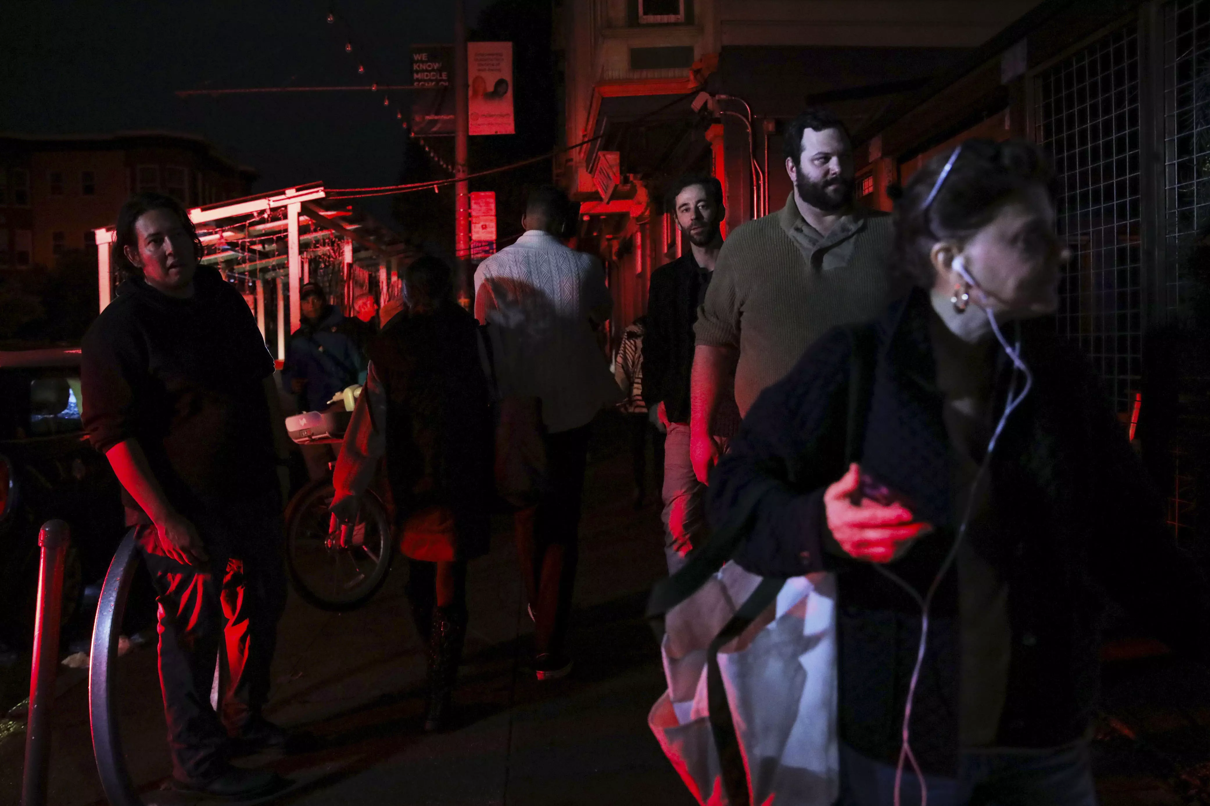 Pedestrians walk in the dark on Hayes Street after a major power outage in San Francisco on Saturday, Dec. 20, 2025. (Yalonda M. James/San Francisco Chronicle via AP)
