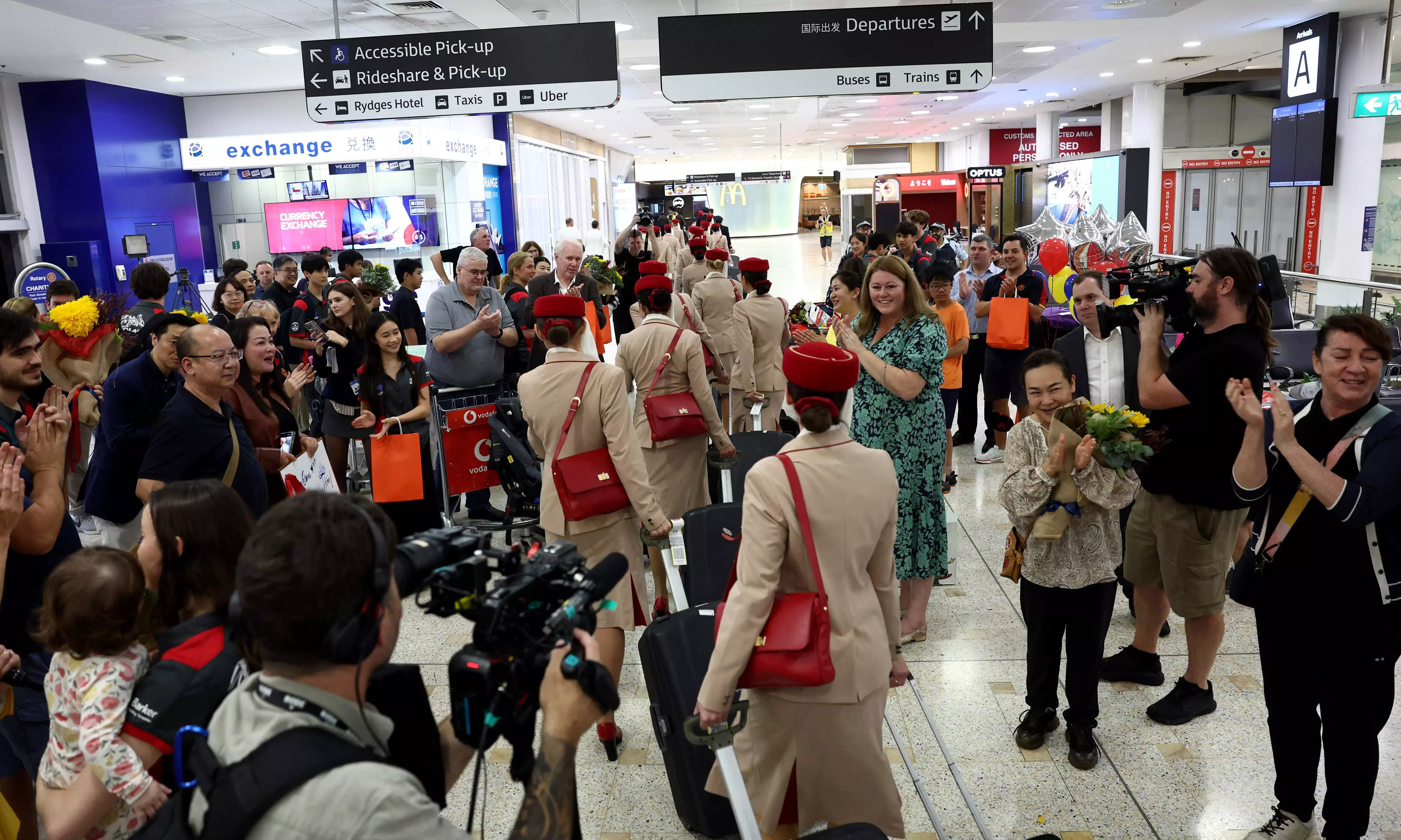 Families and friends of the passengers cheer Emirates crew members after their arrival on a flight from Dubai at Sydney Kingsford Smith International Airport on March 4, 2026. (Photo by Izhar KHAN / AFP)