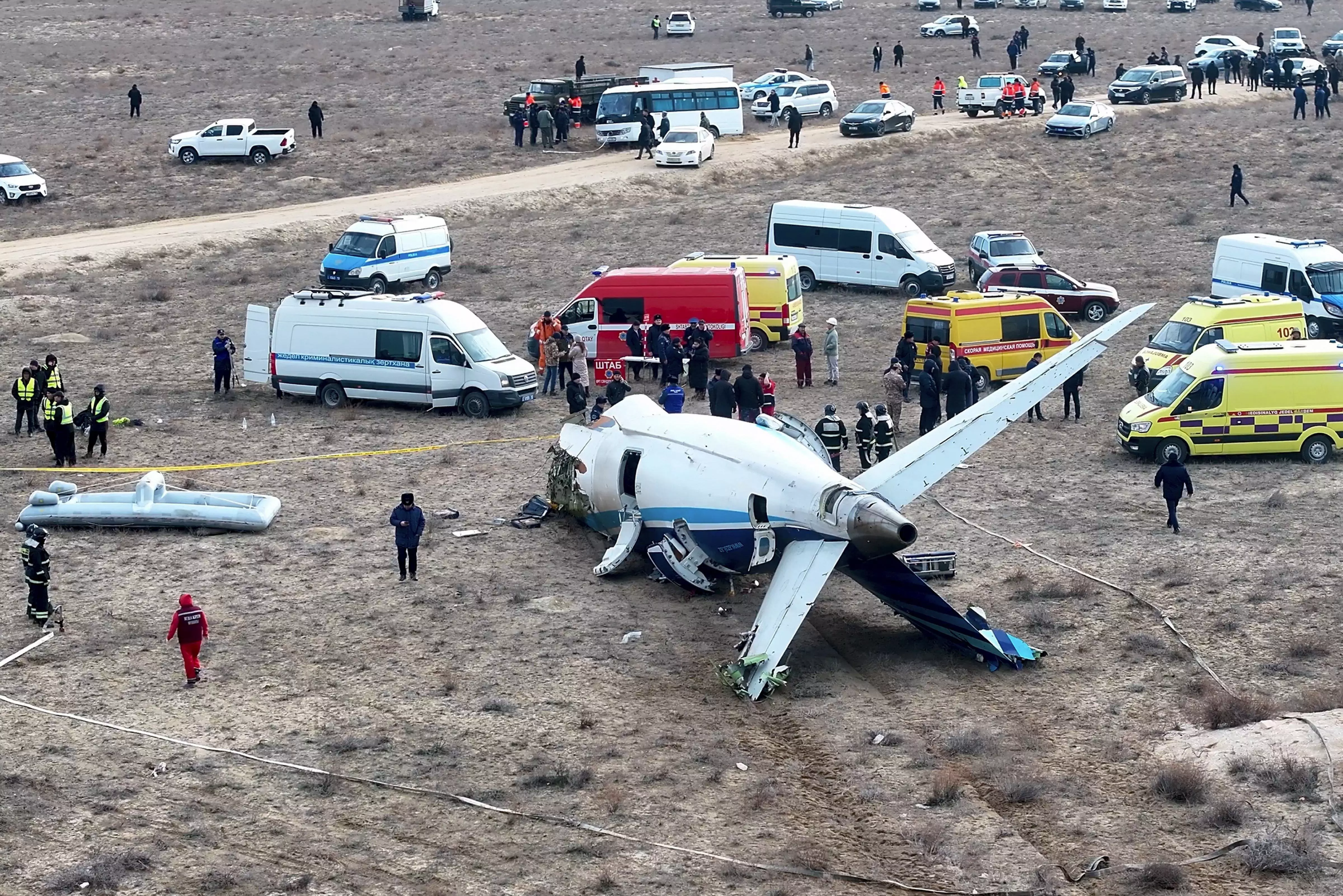 The wreckage of Azerbaijan Airlines Embraer 190 lays on the ground near the airport of Aktau, Kazakhstan, Wednesday, Dec. 25, 2024. (AP Photo/Azamat Sarsenbayev)