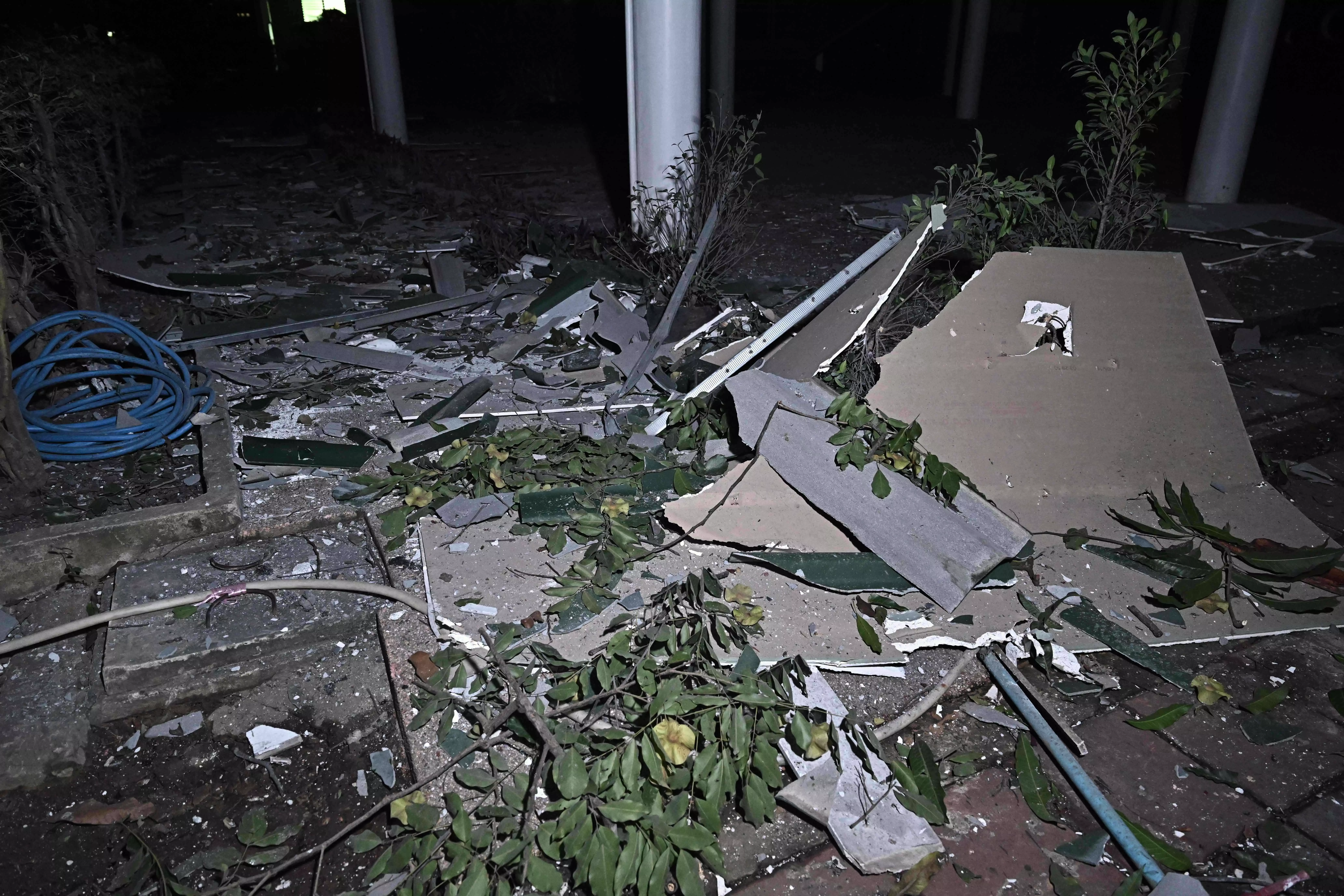 Debris is pictured on the ground at Phanom Dong Rak Hospital, which sustained damage after being hit by Cambodian artillery, in the Thai border province of Surin on July 24, 2025. (Photo by AFP)