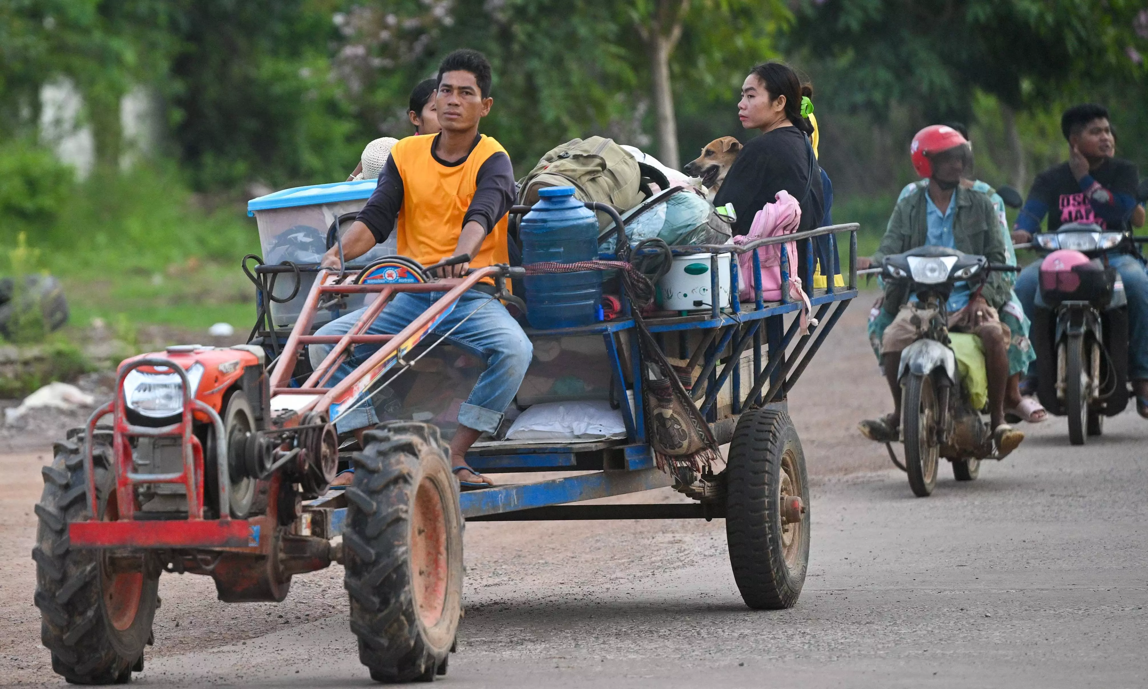 People flee their homes near the border between Cambodia and Thailand in Oddar Meanchey province on July 25, 2025. (AFP Photo)