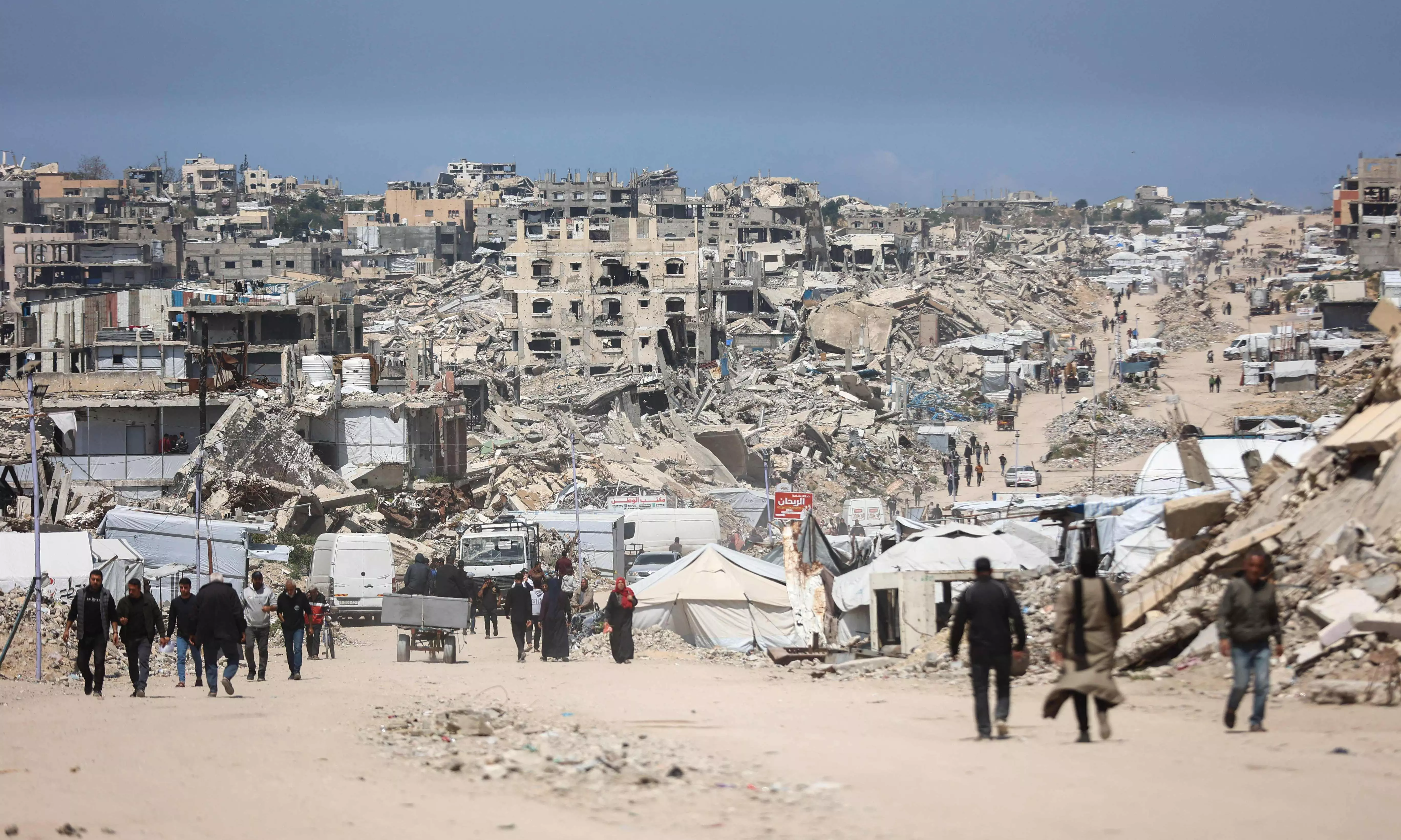 Palestinians walk amid the rubble of destroyed buildings in the Jabalia refugee camp in the northern Gaza Strip on April 13, 2026. (Photo by Omar AL-QATTAA / AFP)