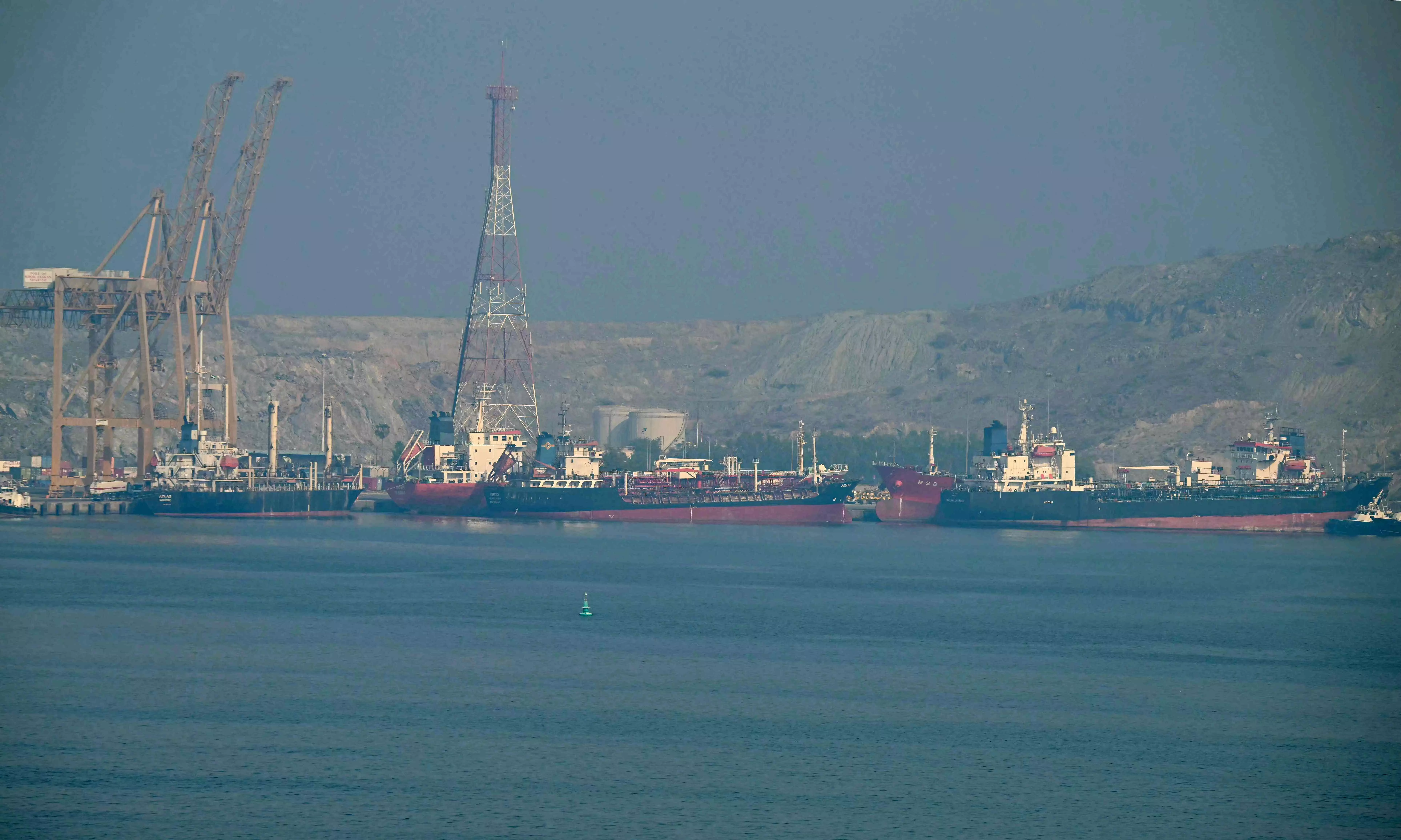 Tankers are seen at the Khor Fakkan Container Terminal, the only natural deep-sea port in the region and one of the major container ports in the Sharjah Emirate, along the Strait of Hormuz, a waterway through which one-fifth of global oil output passes on June 23, 2025. (Photo by Giuseppe CACACE / AFP)