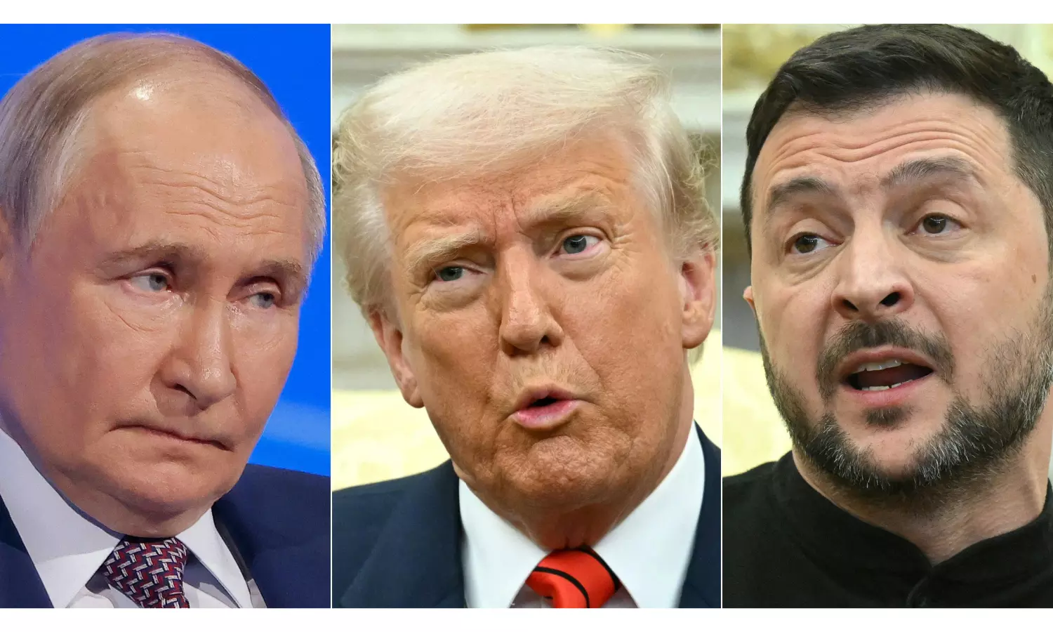 This combination of pictures created on March 18, 2025 shows, L-R, Russian President Vladimir Putin in Moscow on March 18, 2025 and US President Donald Trump and Ukraine's President Volodymyr Zelensky in the Oval Office of the White House in Washington, DC, February 28, 2025. (AFP Photo)